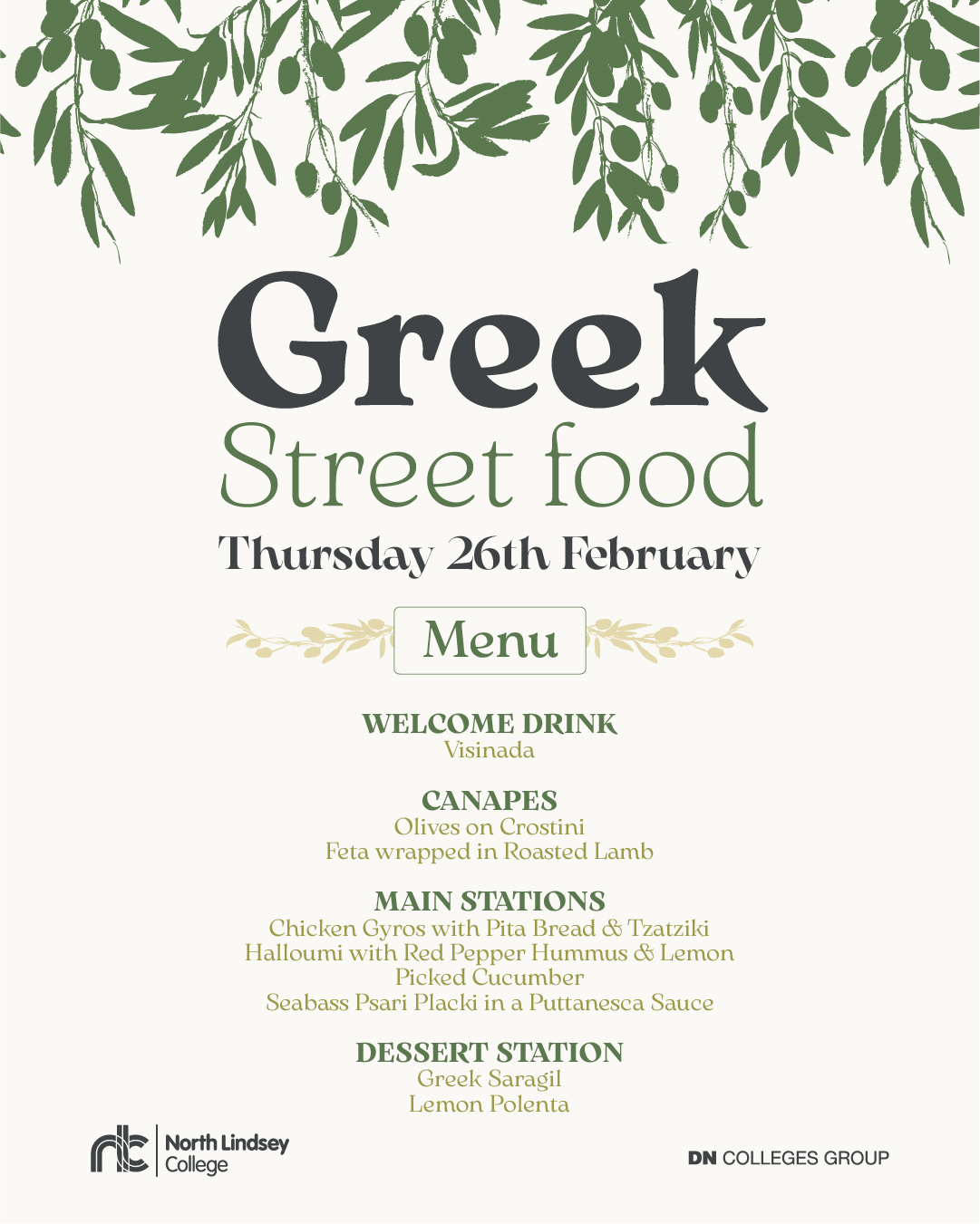 Our Travel and Catering departments are hosting an exciting evening of good food and good vibes. You’ll enjoy a delicious Greek-themed menu, including a welcome drink, all created and served by our talented students.